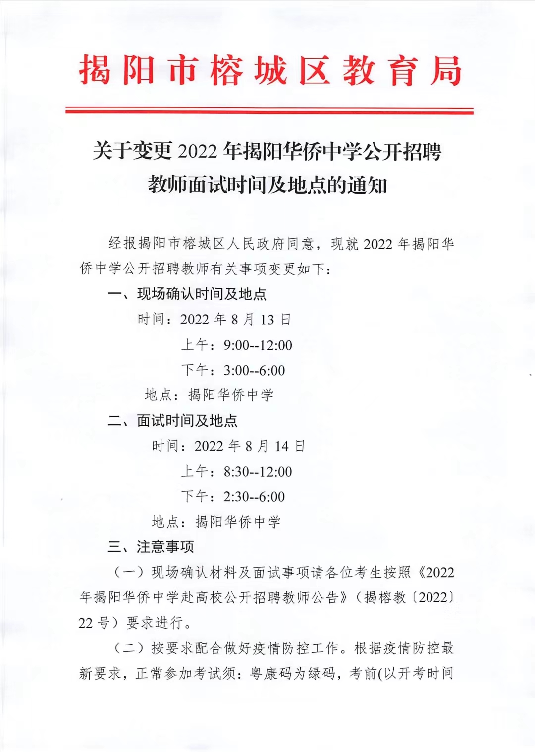 关于变更2022年揭阳华侨中学公开招聘教师面试时间及地点的通知
